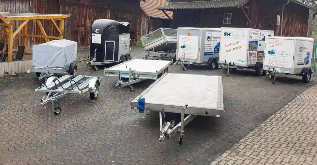 Mieten können Sie einen der über 80 praktischen Anhänger und zwar zu günstigen Preisen - Stunden- oder Tageweise. Gerade wenn Sie für ein größeres Bauvorhaben Materialien und Werkzeuge einkaufen, bietet sich die Anhänger-Vermietung von Sven Küffner - SK colours an. Für Transporte wie Umzüge, Fahrten zur Mülldeponie, transportieren Sie ihre Pferde oder in der Motorradzeit ihr Bike. Probieren Sie es aus und machen Sie sich die anstehenden Arbeiten leichter!